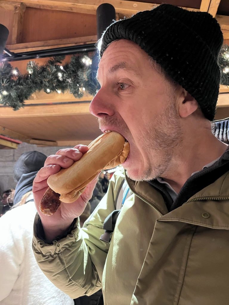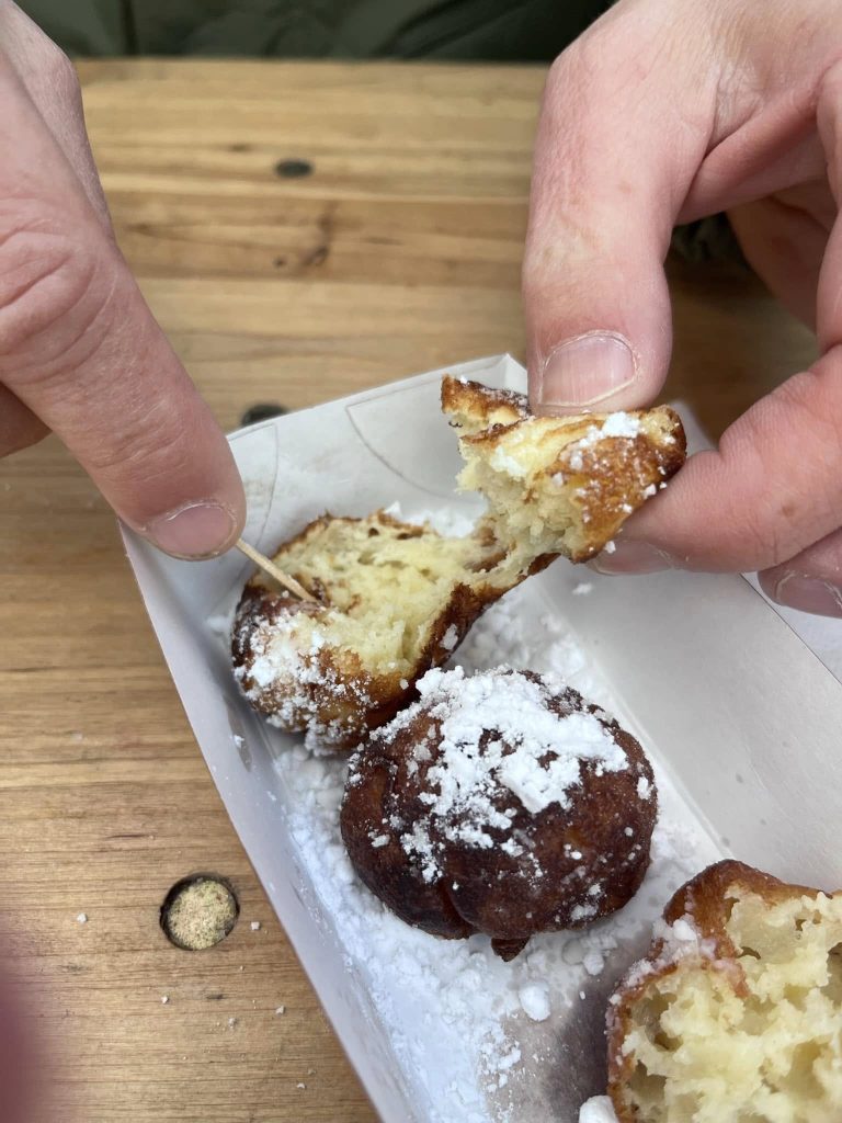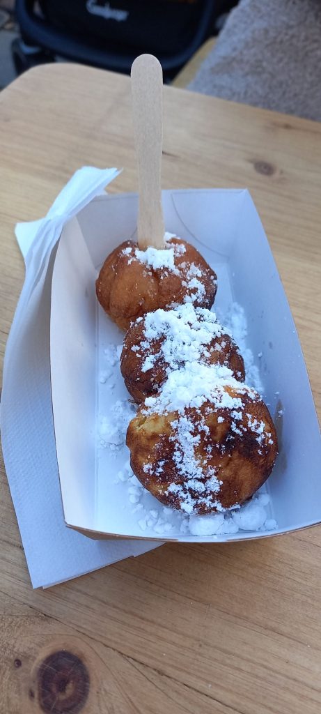 Next, we tried a Ringrimmer (a Danish sausage) for 65 DKK, served hot and bursting with flavour. We also sampled some æbleskiver, the famous Danish pancake balls, served fresh with powdered sugar for 40 DKK for three. To take home a piece of Copenhagen’s holiday spirit, we picked up a gingerbread man tree decoration for 65 DKK, a sweet souvenir from the market.
